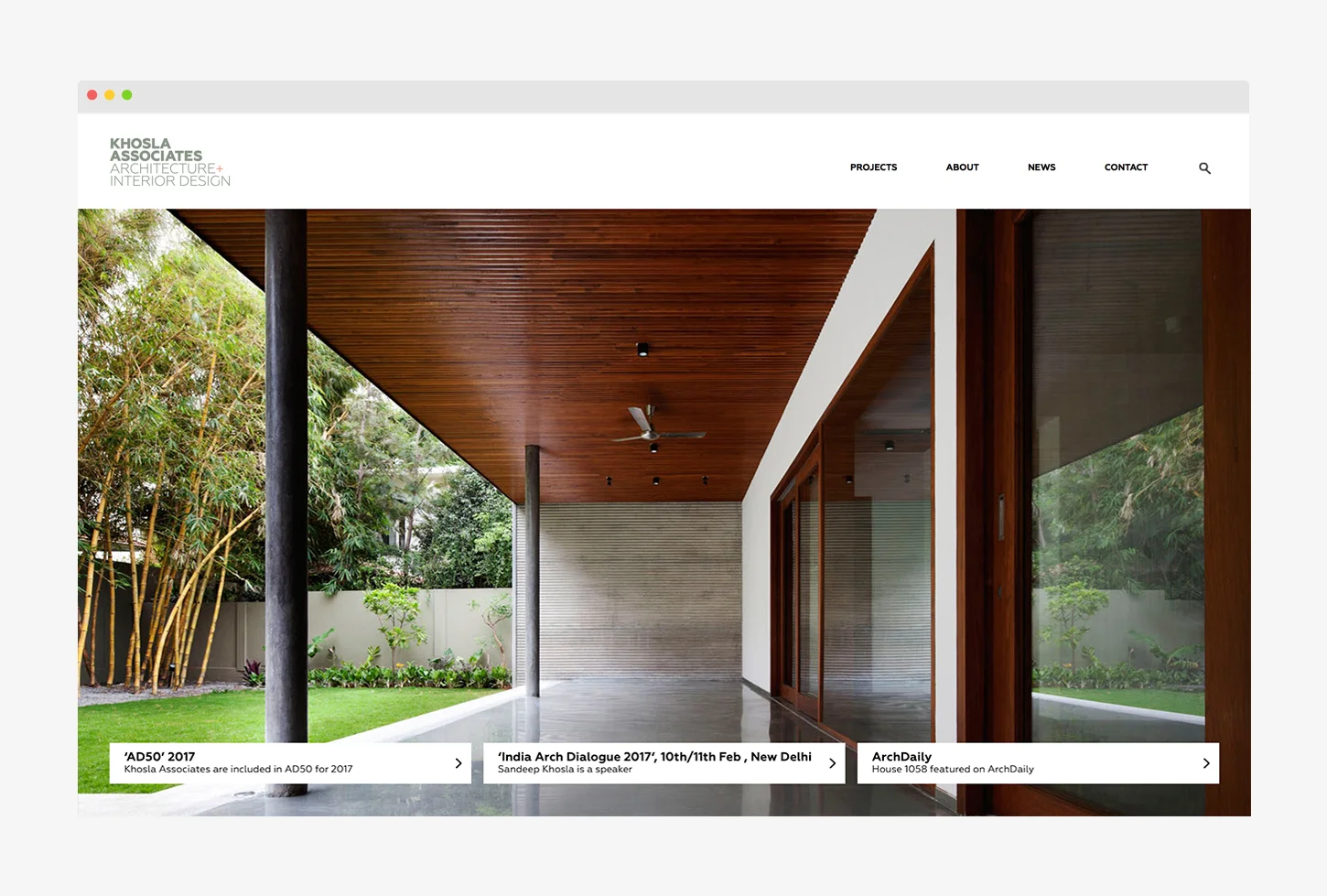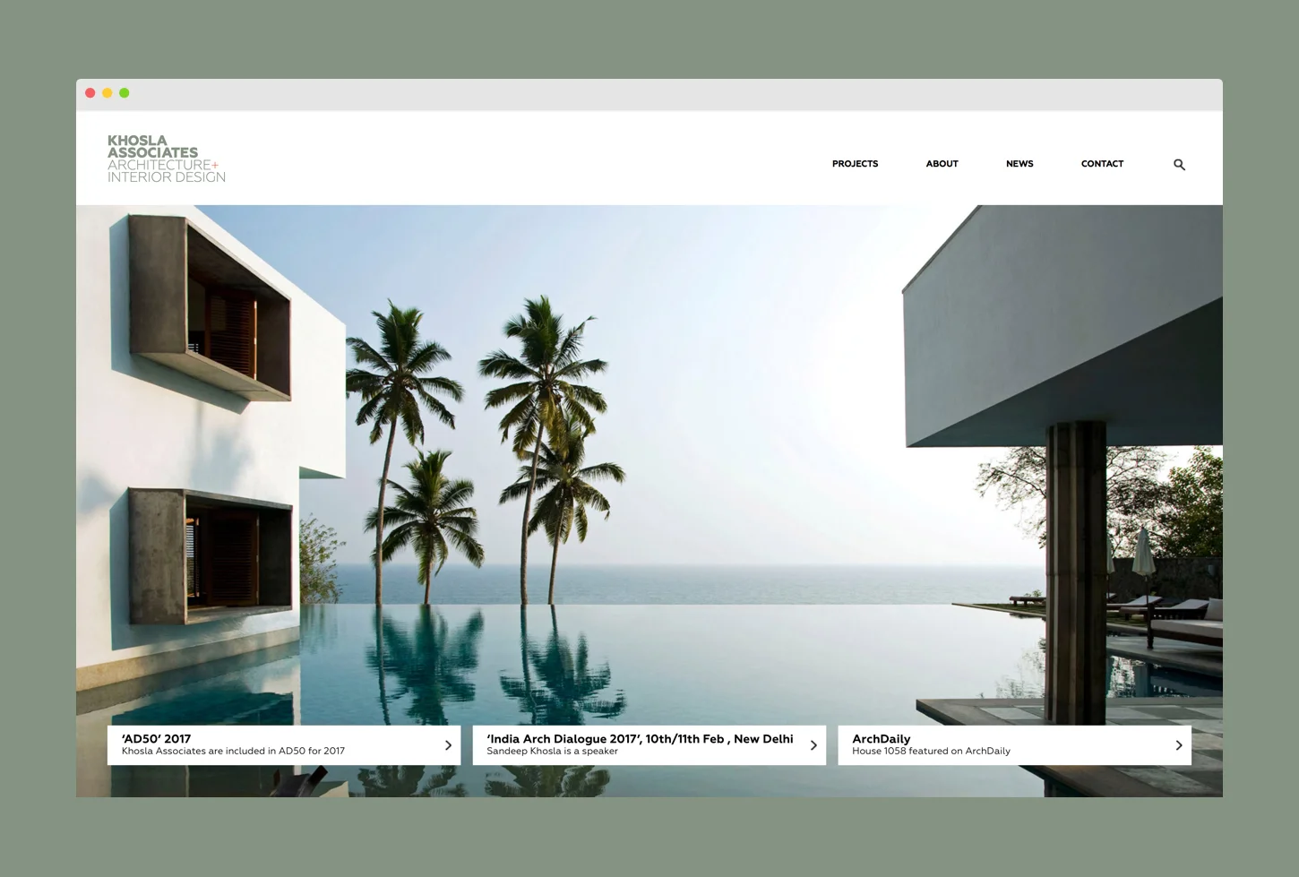 The online experience allows the audience to easily experience the grandeur of the firm's work. Tasteful whitespace and a limited colour palette were used to demonstrate how compelling a monochrome design can be when combined intelligently with full colour imagery to bring about a rich immersive experience of the spaces.